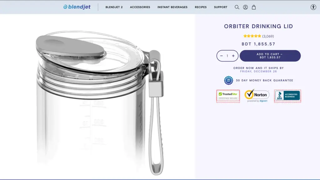 BlendJet displays trust badges, free shipping, and its guarantee prominently. Leesa includes financing options, trial periods, and warranty info right on the product page.