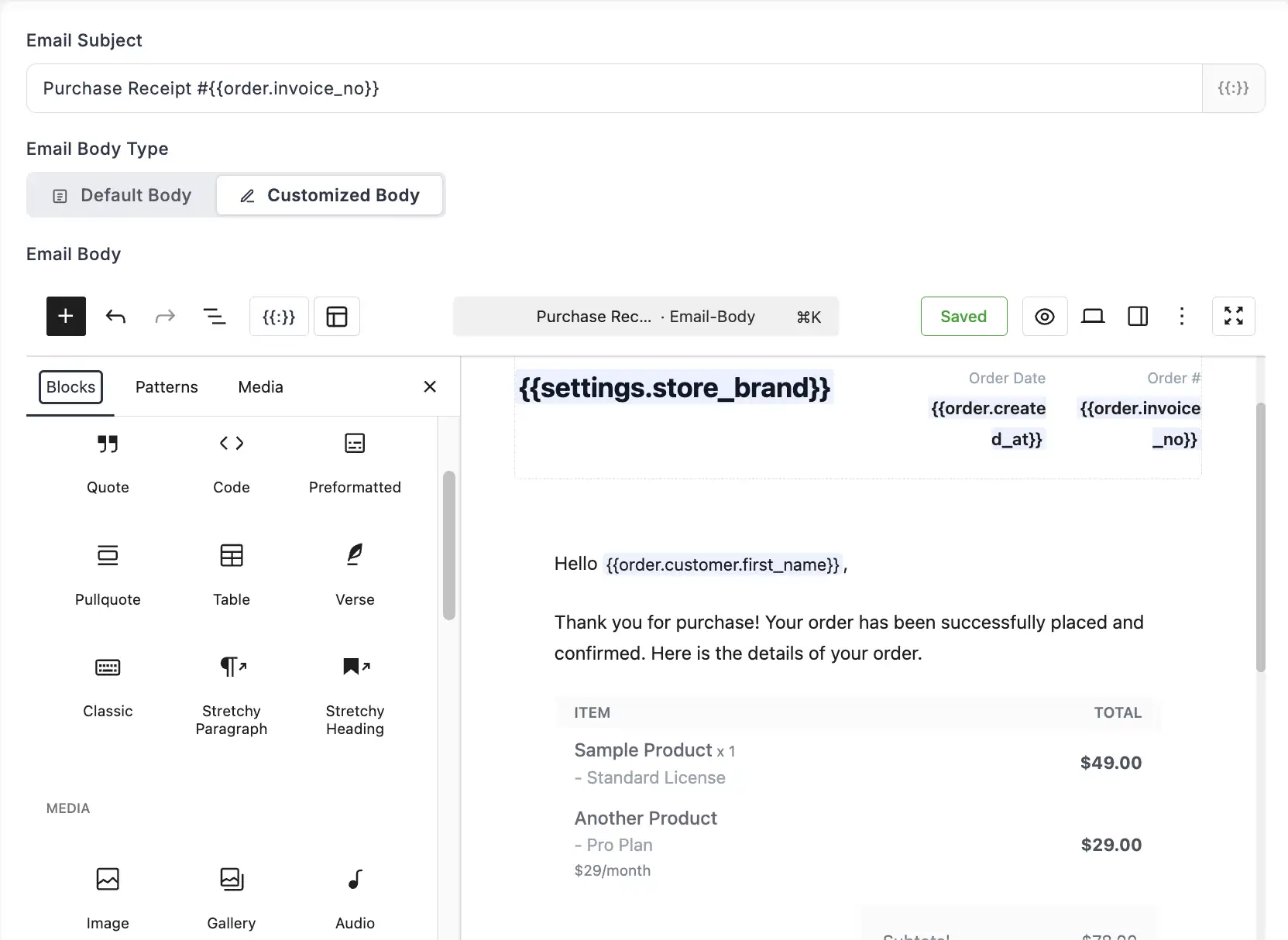 With FluentCart 1.3.15, email templates can now be edited using the same Gutenberg block system familiar to WordPress users.
